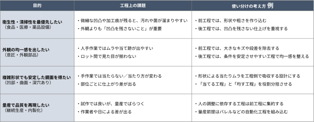 そのため、仕上げ方法を単体で選ぶのではなく、工程全体の中で役割を整理することが重要です。